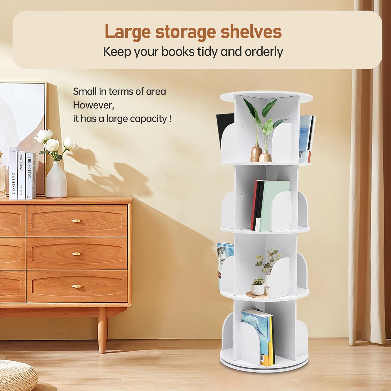 SMART STORAGE WITH ELEGANT ROTATIONThis 4-tier rotating bookshelf tower combines functionality and aesthetics to create a modern solution for organized living. Its 360° rotatable base allows for easy access from all angles, while 16 compartments offer versatile storage for books, collectibles, or supplies. With a stable freestanding structure and a sleek white finish, it blends effortlessly into bedrooms, living rooms, or offices—perfect for families, students, or anyone looking to organize their space in style.KEY FEATURES360° alloy turntable with quiet steel ball bearings4 tiers, 16 compartments—fits up to 160 books132 lbs weight capacityDurable PVC board with thickened base for stabilityRounded safety baffles prevent books from fallingWashable surfaces for easy cleaningIncludes gloves, sandpaper, and decorative tablecloth for installationAPPLICATIONPerfect for bedrooms, children’s rooms, living rooms, study areas, dorms, reading nooks, offices, or classrooms. Store books, dolls, action figures, plants, office supplies, décor, and more.SPECIFICATIONSMaterial: PVC Board, AlloyColor: WhiteStyle: ModernMounting Type: FreestandingNumber of Tiers: 4Compartments: 16Load Capacity: 132 lbsTurntable Diameter: 9.1"Tier Size: 7.5" x 10.6"Overall Product Size: 15.8" x 45.5"Package Size: 19.1" x 20.1" x 7.9"Net Weight: 26 lbsGross Weight: 27.28 lbsPACKAGE INCLUDES1 × 4-Tier Rotating Bookshelf1 × Pair of Protective Gloves1 × Sandpaper1 × Decorative Tablecloth1 × English ManualOther Assembly AccessoriesINSTALLATION & USE NOTESThis product requires self-assembly. Please follow the manual carefully.We recommend wearing gloves during installation to avoid hand injury.Ensure the unit is placed on a flat surface for best stability.The rotating bookshelf tower isn’t just a smart storage solution—it’s a space-saving centerpiece that turns clutter into order and corners into useful zones. Whether for kids or adults, it combines design, function, and convenience.