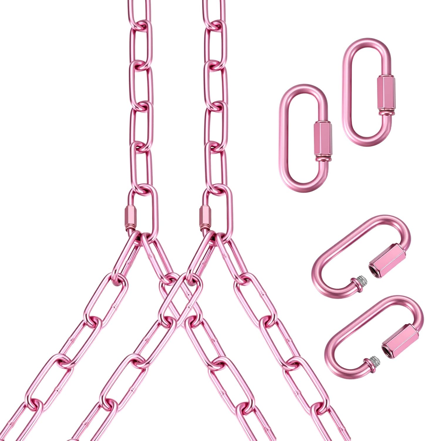 Features: Upgrade your swing or hanging chair setup with this heavy-duty Y-shaped swing chain kit, built for stability, silence, and strength. Made from zinc-plated material, this kit features two Y-style chain assemblies—each consisting of long and short chains for flexible installation on a variety of frames, beams, or ceilings. Designed for performance, this swing chain set supports up to 881 lbs working load and boasts a breaking strength of 2204 lbs. The smooth surface finish not only adds elegance but also reduces friction, allowing for quiet and seamless swinging with no annoying creaks. Whether you're hanging a hammock on the porch, installing a chair indoors, or setting up a punching bag in your home gym, this kit has you covered. The 4 included M5 quick links make setup simple and secure. With resistance to rust, corrosion, and noise, it's a long-lasting solution for comfort and durability. Suitable for indoor and outdoor use all year round. Specifications: Material: galvanized iron Color: black Size: as shown Package includes: 4 x M5 quick links 2 x Y-shaped chain Notes: Manual measurement, please allow slight errors on size. The color may exist a slight difference due to different screen displays